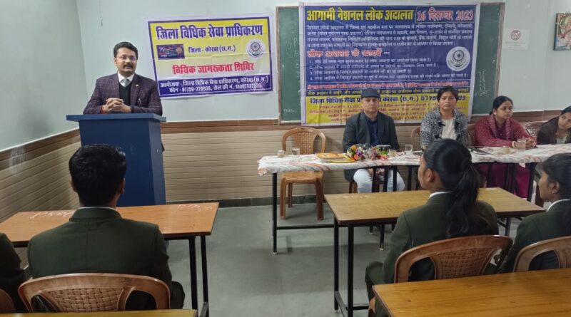 कोरबा :- जिला न्यायाधीश एवं अध्यक्ष जिला विधिक सेवा प्राधिकरण कोरबा श्री बीएल कटवार, के मागदर्शन एवं निर्देशानुसार जिला विधिक सेवा प्राधिकरण कोरबा के द्वारा विद्यालय-महाविद्यालय में नियमित रूप से विधिक जागरूकता शिविर का आयोजन किया जा रहा है।