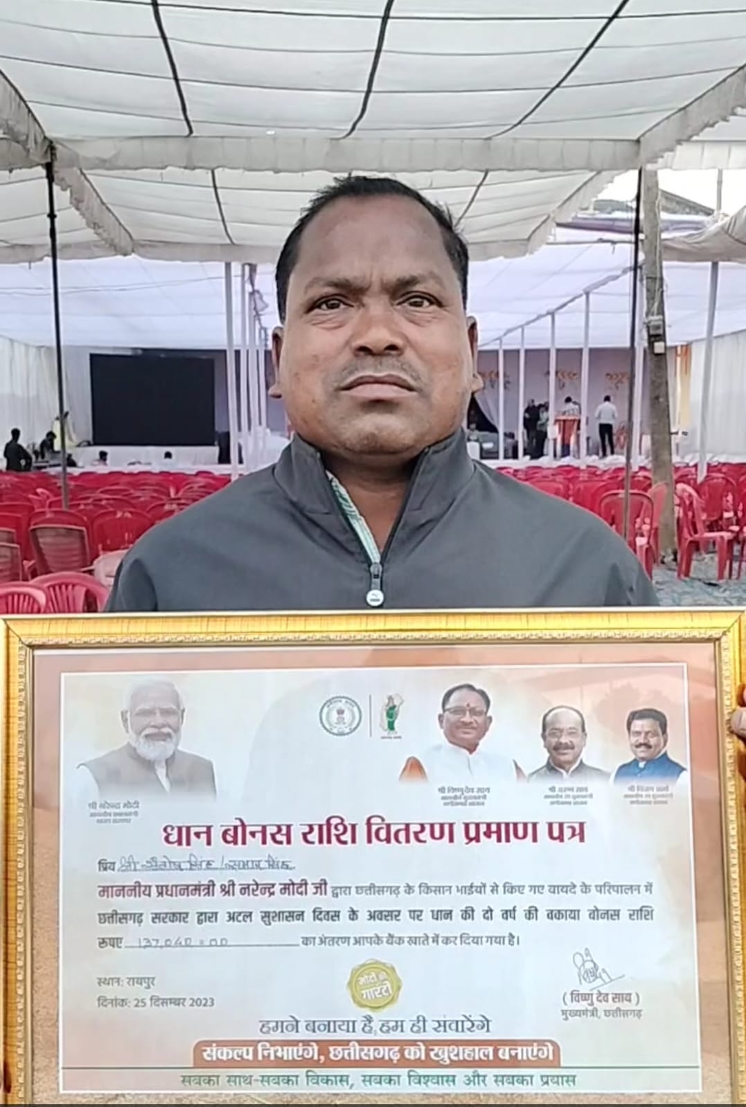 कोरबा :- मुख्यमंत्री विष्णु देव साय के नेतृत्व में शासन द्वारा किसानों को दो साल के धान खरीदी की बकाया बोनस राशि प्रदान करने से राज्य के किसानों के चेहरे में प्रसन्नता छाई है। सरकार बनते ही पूर्व प्रधानमंत्री अटल बिहारी वाजपेयी के जन्म दिवस के शुभ अवसर पर प्रदेश सरकार ने अपना किया वादा पूरा किया है। यह बोनस किसानों के लिए बड़ी सौगात लेकर आया है। बोनस राशि मिलने से कोरबा जिले के किसान प्रफुल्लित होकर छत्तीसगढ़ सरकार के जन कल्याणकारी निर्णय के प्रति कृतज्ञता प्रकट कर रहे हैं।