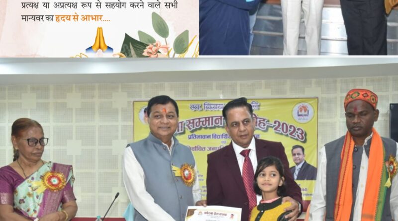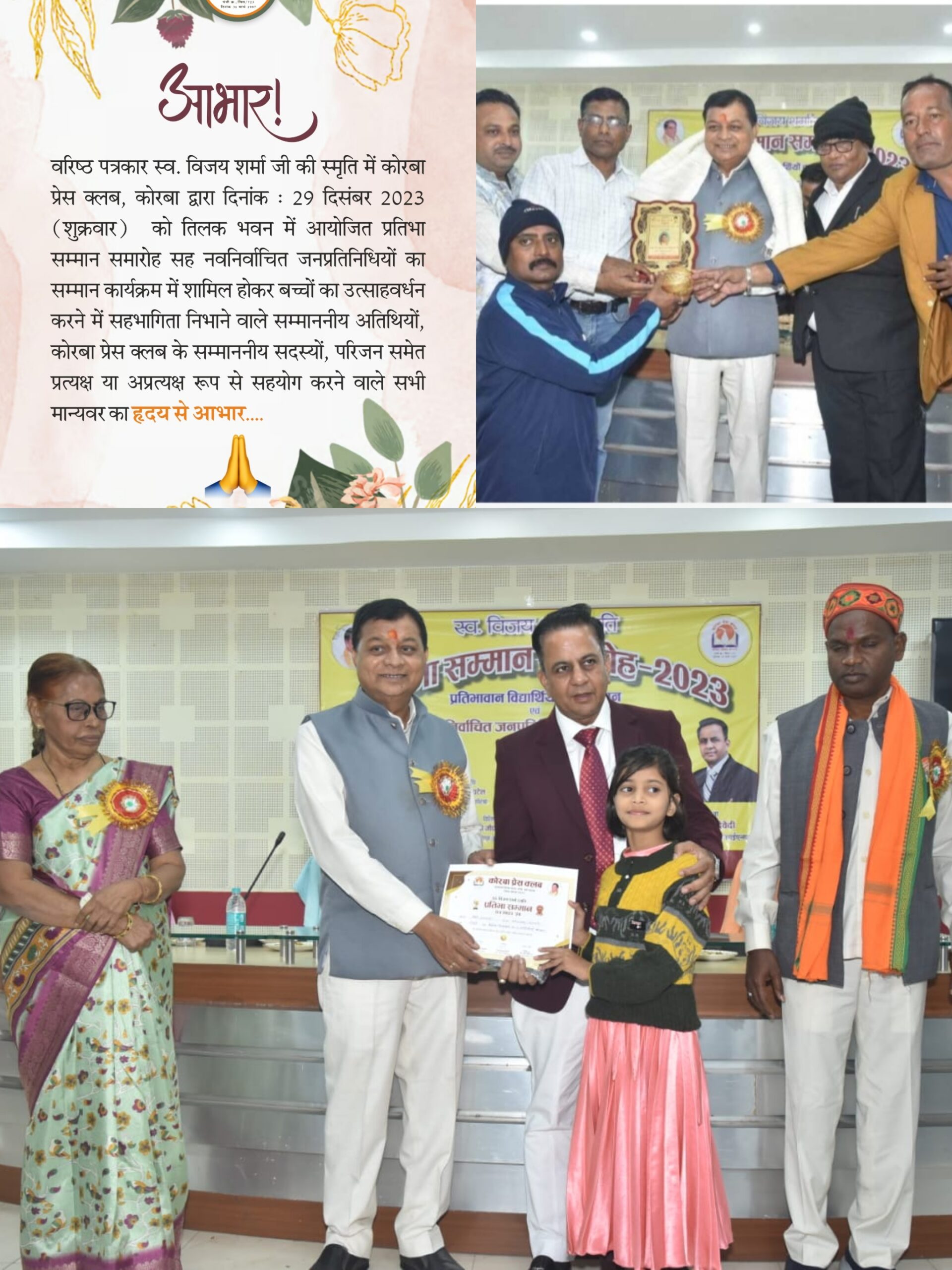 कोरबा :- कोरबा के वरिष्ठ पत्रकार रहे स्व. विजय शर्मा की स्मृति में कोरबा प्रेस क्लब द्वारा सदस्यों के स्कूल एवं कॉलेज में अध्ययनरत प्रतिभाशाली बच्चों के लिए प्रत्येक वर्ष प्रतिभा सम्मान समारोह का आयोजन किया जाता है। इस वर्ष शुक्रवार 29 दिसंबर को स्व. विजय शर्मा स्मृति प्रतिभा सम्मान समारोह-2023 सह नवनिर्वाचित जनप्रतिनिधियों का सम्मान समारोह का आयोजन किया गया।