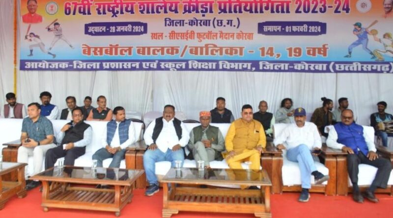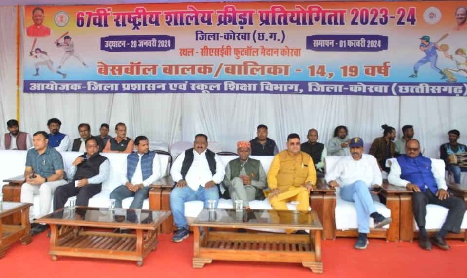 कोरबा :- 67वीं राष्ट्रीय शालेय क्रीड़ा प्रतियोगिता के अंतर्गत जिले के सीएसईबी फुटबॉल ग्राउण्ड में आयोजित बेसबॉल प्रतियोगिता 2023-24 का आज विधायक कटघोरा श्री प्रेमचन्द्र पटेल की उपस्थिति में समापन हुआ। इस अवसर पर नगर निगम सभापति श्याम सुंदर सोनी, जिला शिक्षा अधिकारी जी.पी. भारद्वाज, क्रीडा अधिकारी दीनू पटेल सहित अन्य जनप्रतिनिधि, विभागीय अधिकारी, विभिन्न प्रांतो से आए प्रतिभागी एवं उनके कोच उपस्थित थे।