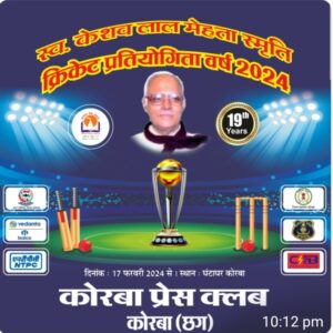 उल्लेखनीय है कि अंचल के वरिष्ठ पत्रकार रहे स्वर्गीय केशव लाल मेहता जी की स्मृति में कोरबा प्रेस क्लब द्वारा विगत 18 वर्षो से उक्त प्रतिष्ठित क्रिकेट प्रतियोगिता का आयोजन घंटाघर मैदान में हो रहा है।आयोजन का यह 19वां वर्ष है।