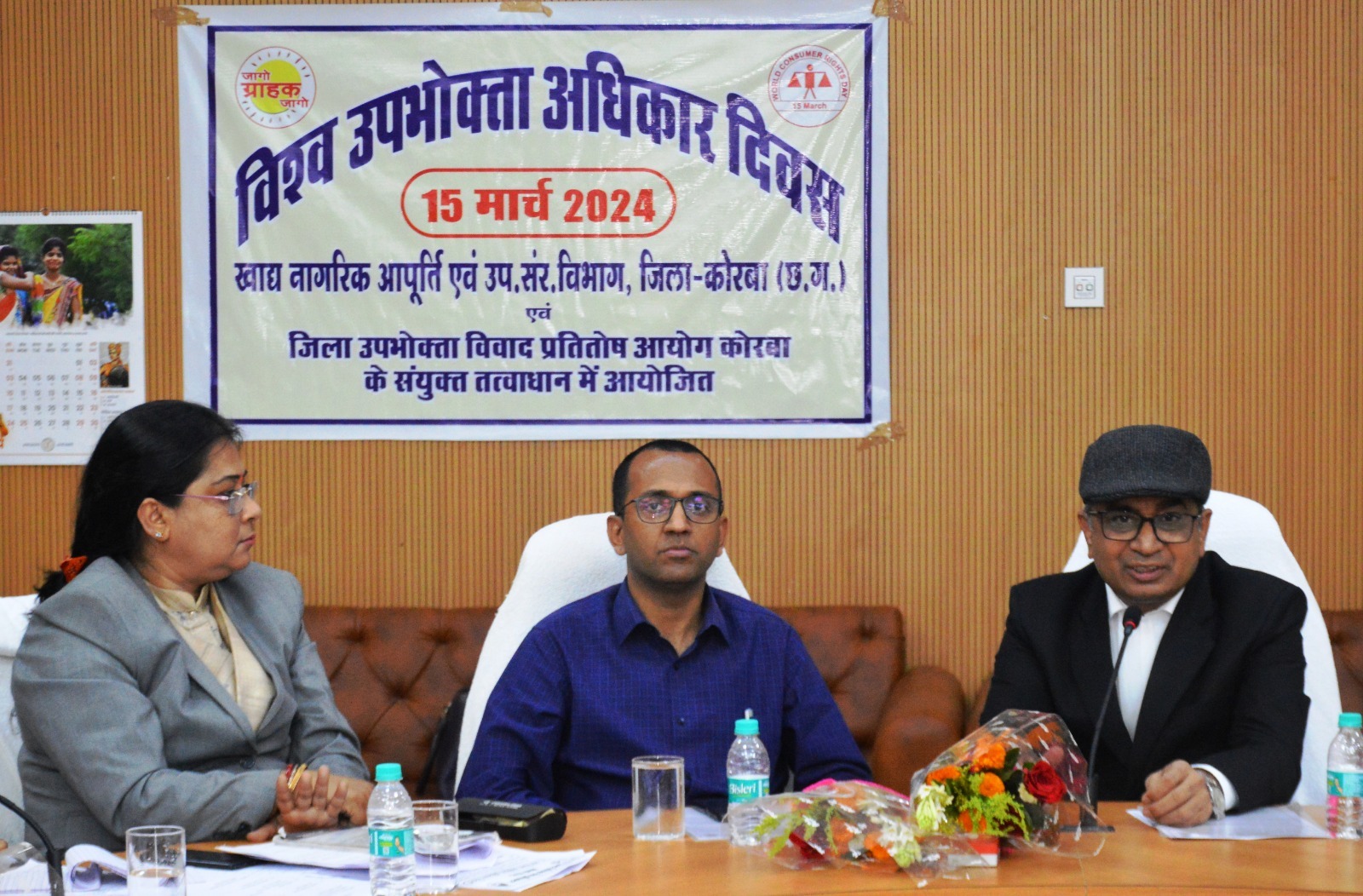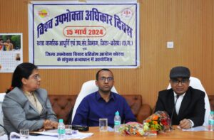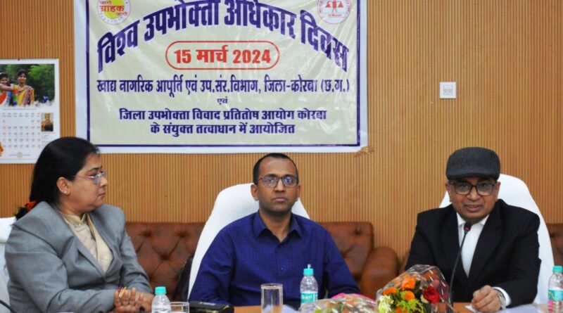 कोरबा :- विश्व उपभोक्ता अधिकार दिवस के अवसर पर जिला व सत्र न्यायाधीश सत्येंद्र कुमार साहू की अध्यक्षता में कलेक्ट्रेट सभाकक्ष में उपभोक्ताओं को जागरूक बनाने के उद्देश्य से कार्यशाला का आयोजन किया गया। कार्यक्रम में उपभोक्ताओं के हितों की रक्षा एवं उनके अधिकारों के प्रति जागरूक बनाने की दिशा में प्रभावी कार्य करने हेतु आवश्यक निर्देश दिए गए। कार्यक्रम में कलेक्टर अजीत वसंत, सचिव जिला विधिक सेवा प्राधिकरण श्रीमती शीतल निकुंज, जिला उपभोक्ता विवाद प्रतितोष आयोग की अध्यक्ष श्रीमती रंजना दत्ता, सदस्य सुश्री ममता दास , पंकज कुमार देवड़ा , खाद्य अधिकारी आशीष चतुर्वेदी सहित नापतौल विभाग, चिकित्सा विभाग सहित जिला चेम्बर ऑफ कामर्स के सदस्य, जिला अधिवक्ता संघ, बैक एवं बीमा कंपनी के अधिकारी, स्कूल एवं कॉलेज के छात्र/छात्राएं एवं अन्य संस्था के सदस्य तथा आमजन उपस्थित रहे।