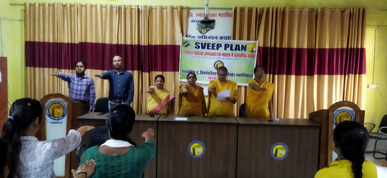 महाविद्यालय के प्रभारी प्राचार्या डॉ. श्रीमती रेणु बाला शर्मा ने उपस्थित विद्यार्थियों एवं महाविद्यालय के प्राध्यापकों को लोकसभा चुनाव में अनिवार्य मतदान हेतु शपथ दिलाई। गृह विज्ञान के विभागाध्यक्ष एवं एनएसएस के कार्यक्रम अधिकारी अजय पटेल ने युवा मतदाताओं को स्वयं जागरूक होने के साथ साथ परिवार एवं समाज के अन्य लोगों को भी मतदान के दिन अनिवार्य रूप से मतदान करने हेतु प्रेरित किया।
