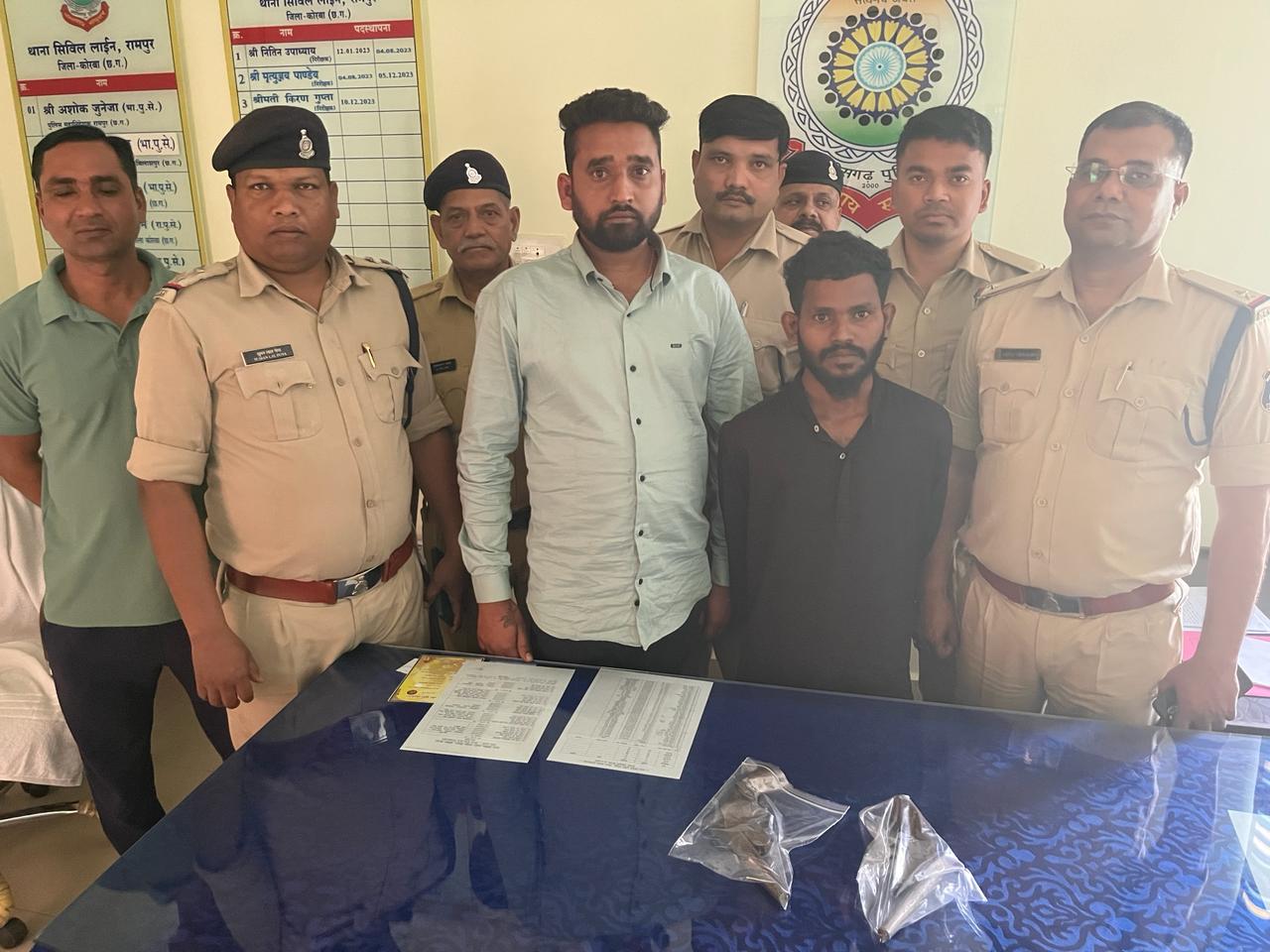 कोरबा :- पुलिस अधीक्षक सिद्धार्थ तिवारी द्वारा क्षेत्र में अपराधो पर अंकुश लगाने हेतु कार्यवाही के निर्देश पर अतिरिक्त पुलिस अधीक्षक यू.बी.एस. चौहान, नगर पुलिस अधीक्षक दर्री रविन्द्र कुमार मीना तथा नगर पुलिस अधीक्षक कोरबा भूषण एक्का के मार्गदर्शन में सायबर सेल कोरबा तथा थाना सिविल लाईन रामपुर एवं थाना कोतवाली की संसुक्त टीम द्वारा मुखबिर सूचना पर *आरोपी रुपेश गिरी गोस्वामी पिता तोरण गिरी गोस्वामी उम्र 30 वर्ष पता ग्राम धारा शिव खोखरा थाना पामगढ़ जिला- जांजगीर चांपा* को ऑडिटोरियम घंटाघर के पास सार्वजनिक स्थान में अवैध रूप से अपने पास एक देसी कट्टा रख कर उसे बिक्री करने के लिए ग्राहक की तलाश कर रहा है उक्त सूचना पर पुलिस की टीम के द्वारा घेराबंदी कर रुपेश गिरी को पकड़ा गया उसके कब्जे से एक देशी कट्टा बरामद हुआ। जिस पर आरोपी के विरूद्ध अपराध क्रमांक 191/2024 धारा 25 आर्म्स एक्ट के तहत गिरफ्तार कर न्यायिक रिमाण्ड पर भेजा गया।
