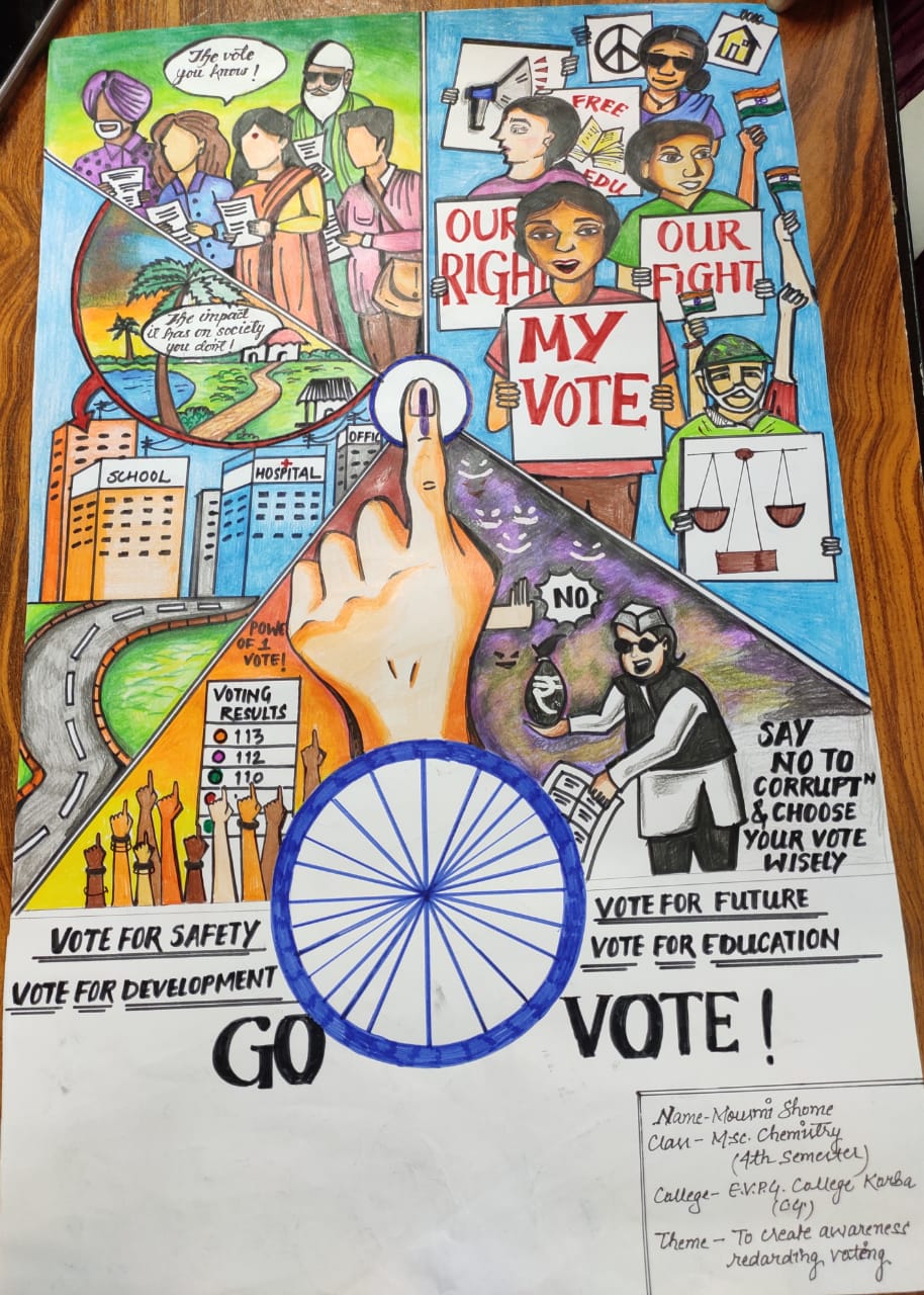 प्राचार्य डॉ साधना खरे के निर्देशन में पोस्टर मेकिंग प्रतियोगिता में मनीष यादव ,शारदा, सोमनाथ, आस्था, हेमलता, दिव्या, ममता, तृप्ति, रूपेश राठिया, विक्रांत राठिया, संगम दुबे, अजय दास, अविनाश कँवर, योगेश राठिया, नरेश राठिया, साकेत सिदार, ज्योतिका राठिया, ईशा साहू, सरोजनी साहू, श्वेता कोसले, प्रीति साव, गीतिका यादव, महेंद्र कुमार, भूपेंद्र, गुलशन, श्वेता सक्सेना, काजल कोसले ,श्रुति, प्रकाश, श्वेता शर्मा, जय लक्ष्मी, बबिता, रीना ,रिंकी ,सुमन, ख्याति ,अंशु, बिंदिया, ज्योति खरे, हेमा, नीलम भुवनेश्वरी , प्रतिभा आदि विद्यार्थियों ने भाग लेकर मतदाता जागरूकता कार्यक्रम को सफल बनाने में महत्वपूर्ण योगदान दिया। इसी तरह सेजेस गोपालपुर में प्राचार्य श्रीमती सीमा भारद्वाज के निर्देशन में विद्यार्थियों ने मतदान का संकल्प लिया।