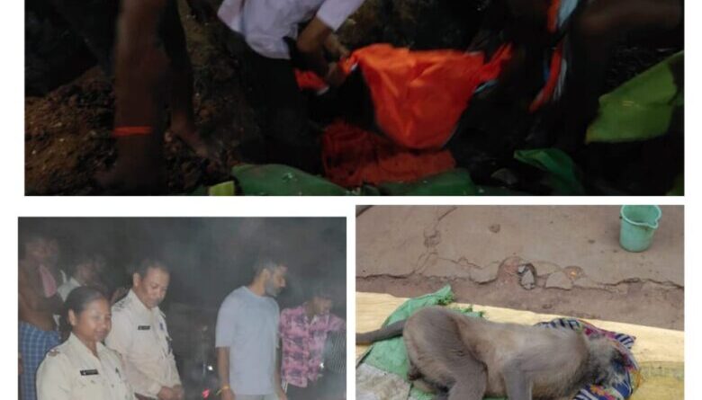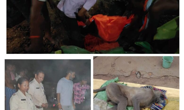 कोरबा :- कोरबा जिले के करतला विकासखंड अंतर्गत ग्राम गिधौरी में एक वानर विगत कुछ दिनों से बीमार था, जिसका उपचार पशु चिकित्सा विभाग और वन विभाग के देखरेख में चल रहा था। परन्तु उसकी इलाज के दौरान मृत्यु हो गई। ग्राम सरपंच, समस्त ग्रामवासी, वन विभाग टीम के सामूहिक सहयोग से मृत वानर को विधि-विधान से अंतिम समाधि ग्राम के नीम चौक में दी गयी। इस अवसर पर बड़ी संख्या में ग्रामवासी उपस्थित थे।