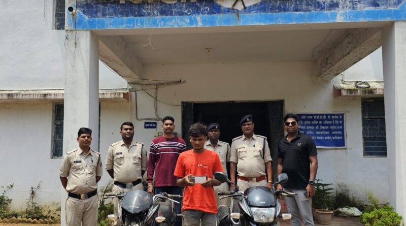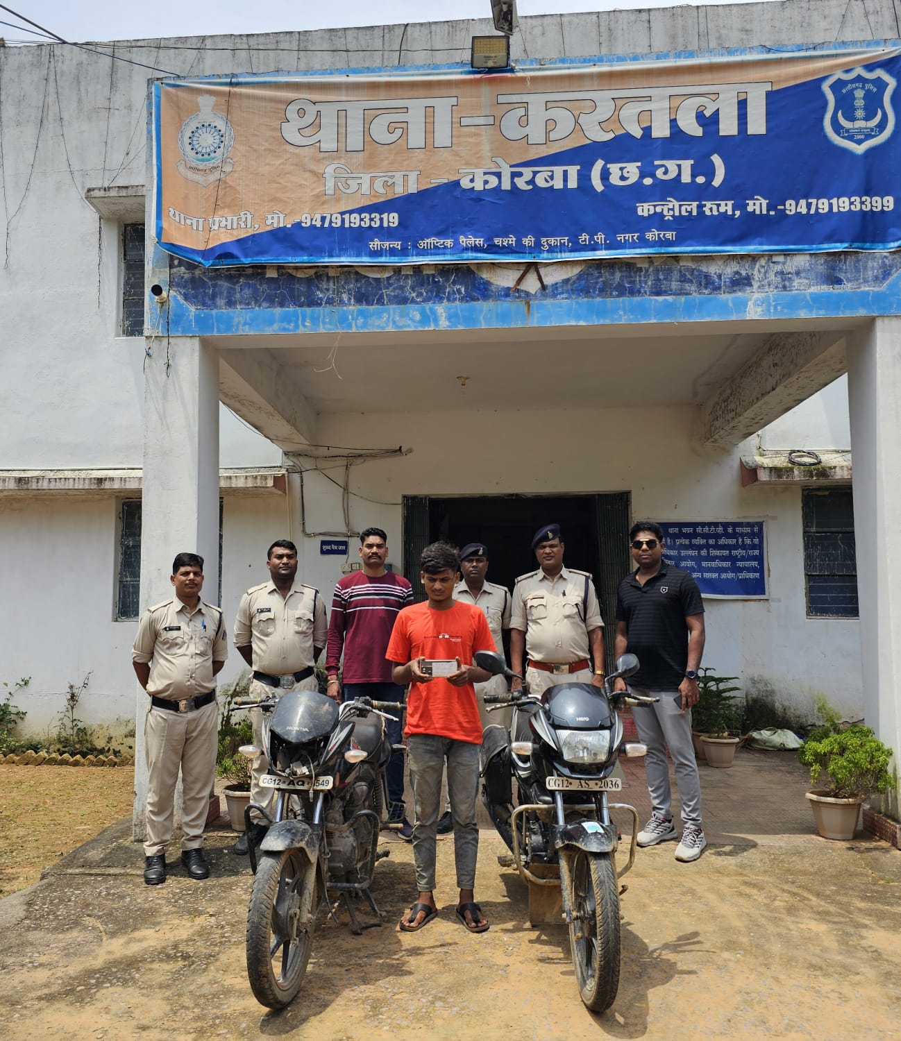 Korba :- दिनांक 16.08.2024 को सकदूकला निवासी प्रार्थीया श्रीमती सुचित्रा चौहान, थाना उपस्थित आकर रिपोर्ट दर्ज करायी कि, दोहपर 03 बजे अपने गांव से पैदल नोनबिर्रा च्वाईस सेंटर के०वाई०सी० कराने जाते समय रास्ते में दो अज्ञात मोटर सायकल चालक प्रार्थीया के हाथ में रखे वीवो मोबाईल को लूटकर करतला तरफ भागने की रिपोर्ट पर थाना करतला में अपराध कमांक 76/2024 धारा 309 (4) बीएनएस एवं, कुदमुरा निवासी प्रार्थी मनमोहन राठिया की मोटर सायकल को दो अज्ञात व्यक्ति द्वारा चोरी कर ले जाने की रिपोर्ट पर कमांक 77/2024 धारा 303 (2) 3 (5) बीएनएस कायम कर वरिष्ठ अधिकारियों को अवगत कराकर पुलिस अधीक्षक सिद्धार्थ तिवारी (भा०पु०से०) से उचित दिशा निर्देश प्राप्त कर अति०पुलिस अधीक्षक यु०बी०एस० चौहान (रा०पु०से०) के मार्गदर्शन में नगर पुलिस अधीक्षक बेनेडिक्ट मिंज (रा०पु० से०) के नेतृत्व में कायमी पश्चात ग्राम कुदमुरा बेरियर पर नाकाबंदी दौरान दो मोटर सायकल चालक पुलिस को देखकर भागने लगे, पीछा कर आरोपी तिलकेजा निवासी शांतनू शर्मा पिता राकेश शर्मा उम्र 18 वर्ष को पकड़ा गया। जिनसे पूछताछ पर बताया कि दोनों घटना को अलग अलग समय पर अपने साथी दिनेश कंवर के साथ करना बताया। आरोपी दिनेश कंवर मोटर सायकल को छोडकर फरार हो गया। आरोपी के पास से घटना में प्रयुक्त मोटर सायकल सीजी 12 ए क्यू 6549 होण्डा साईन एवं प्रार्थीया से लूट की गई मोबाईल एवं चोरी की गई हीरो स्प्लेण्डर मोटर सायकल सीजी 12 ए एस 2036 को जप्त कर, आरोपी को विधिवत गिरफ्तार कर न्यायिक रिमाण्ड पर भेजा गया।