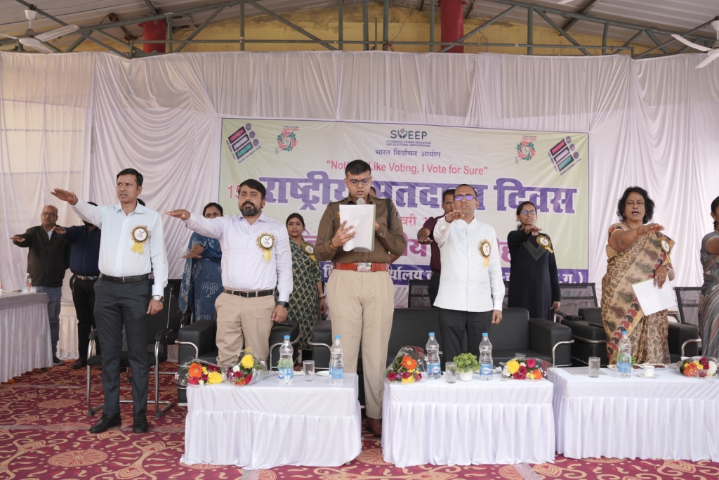 कार्यक्रम में कलेक्टर अजीत वसंत और पुलिस अधीक्षक तिवारी ने उपस्थित लोगों अधिकारी एवं कर्मचारियों महाविद्यालय के प्राध्यापक व नए मतदाता छात्र छात्राओं को निष्ठापूर्वक शांतिपूर्ण निर्वाचन की गरिमा को बनाए रखने और लोकतांत्रिक कर्तव्यों के पालन की शपथ दिलाई। इस दौरान सभी ने लोकतंत्र में अपनी पूर्ण आस्था रखते हुए देश की लोकतांत्रिक परम्पराओं की मर्यादा को अक्षुण बनाए रखते हुए स्वतंत्र निष्पक्ष एवं निर्भीक होकर धर्म वर्ग जाति समुदाय भाषा अथवा अन्य किसी भी प्रलोभन से प्रभावित हुए बिना सभी निर्वाचनों में अपने मताधिकार का प्रयोग करने की शपथ ली। कलेक्टर एवं अन्य अतिथियों ने नवीन युवा मतदाताओं का बैच लगाकर स्वागत किया साथ ही उन्हें फोटोयुक्त मतदाता पहचान पत्र प्रदान कर आगामी निर्वाचन में मतदान के लिए प्रेरित किया।