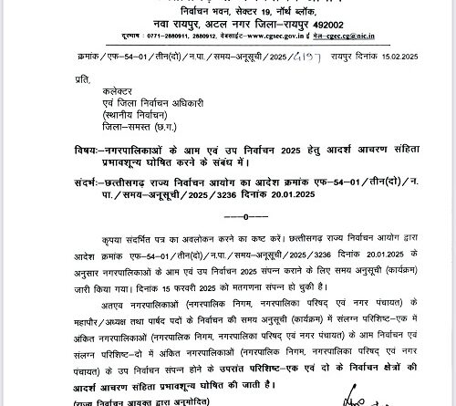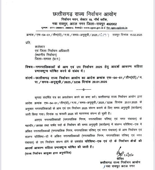कोरबा :- सचिव छत्तीसगढ़ राज्य निर्वाचन आयोग नवा रायपुर अटल नगर रायपुर ने पत्र क्रमांक/एफ-54-01/तीन (दो)/न.पा./समय-अनूसूची/2025/4197 के द्वारा नगरपालिकाओं के आम एवं उप निर्वाचन 2025 हेतु आदर्श आचरण संहिता प्रभाव शून्य घोषित करने के संबंध में कलेक्टर एवं जिला निर्वाचन अधिकारी को जारी किया है। जिसके अंतर्गत आचार संहिता को शून्य घोषित किया गया हैं।