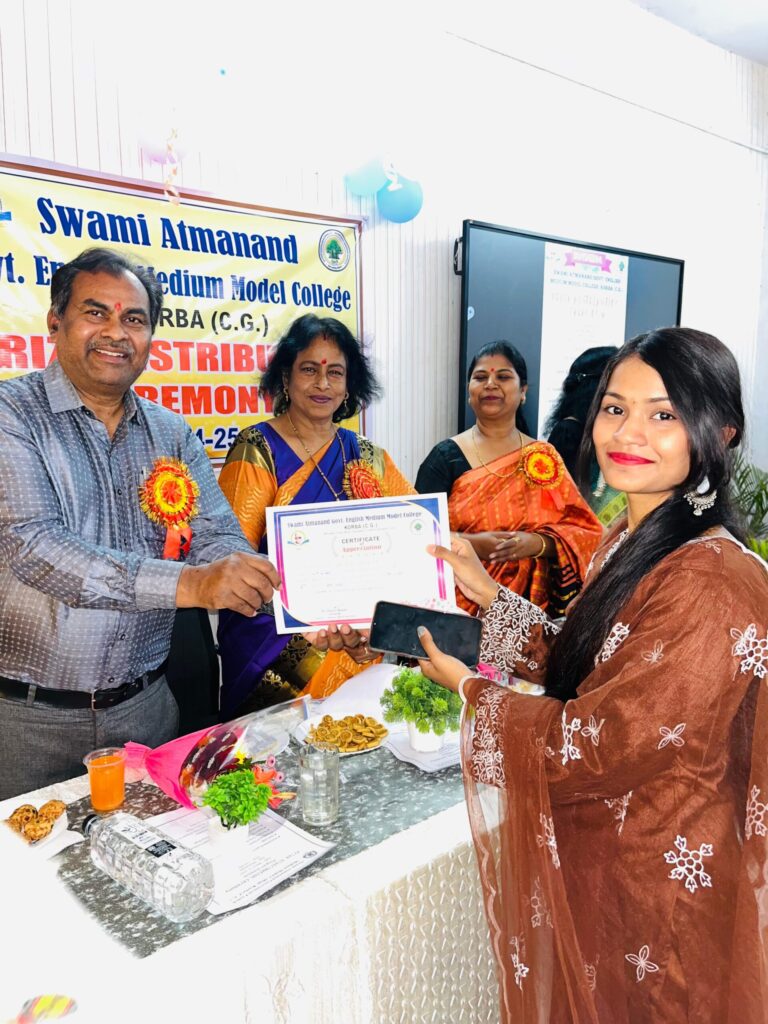 कोरबा :- कोरबा जिले में संचालित स्वामी आत्मानंद शासकीय अंग्रेजी माध्यम आदर्श महाविद्यालय कोरबा ने अपने छात्र-छात्राओं के उत्कृष्ट उपलब्धियों का सम्मान करने के लिए पुरस्कार वितरण समारोह का आयोजन किया। समारोह की मुख्य अतिथि डॉ. श्रीमती शिखा शर्मा, प्राचार्य शासकीय महाविद्यालय, विशिष्ट अतिथि डॉ. सुरेश कुमार रात्रे, प्राचार्य विद्युत गृह उच्चतर माध्यमिक विद्यालय, की गरिमामयी उपस्थिति में संपन्न हुआ।