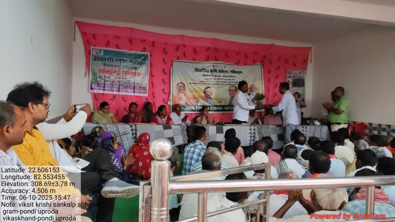 कोरबा :- मगलवार क़ो ग्राम पंचायत पोंडी उपरोड़ा अमरैया पारा स्कूल ग्राउंड मे दूर दराज से आये किसानो क़ो खरीफ पूर्व खेत की तैयारी बीज उत्पादन कार्यक्रम किसान समृद्धि योजना क़ृषि यंत्री कारण योजना क़ो सयुंक्त संचालक कृषि मनोज कुमार चौहान द्वारा किसानो क़ो विकसित क़ृषि सकल्प अभियान के मुख्य उद्देश्य क़ो विस्तार से बताया एवं सभी विभाग के योजनाओं का नियमानुसार लाभ लेने हेतु किसानो क़ो किया प्रेरित क़ृषि विज्ञानं केंद्र के वैज्ञानिक दीपक तवर खरीफ पूर्व खेती की 17% नमक घोल से बीज उपचार जैविक दवाई बनाने की विधि उद्यान मत्स्य पशुपालन विभाग द्वारा नवाचार एवं विभाग मे चल रहे योजनाओं क़ो विस्तार से बताया विकसित क़ृषि सकल्प अभियान मे सी के ठाकुर ASCO ने किसानो क़ो शिविर के माध्यम से अधिक से अधिक लाभ लेने बीज उत्पादन कार्यक्रम मे अधिक से अधिक किसान क़ो जुड़ने और और उसके लाभ के बारे मे बताया जनपद अध्यक्ष श्रीमति माधुरी देवी तवर द्वारा अच्छे से सभी विभागीय योजनाओं क़ो सुनने समझने की अपील एवं उच्च गुड़वत्ता वाले बीज का और सही समय मे बोनी करने हेतु किसानो क़ो सम्बोधित किया ज़नप्रतिनिधि ने खेती क़ो व्यावसायिक तौर पर करने हेतु किसानो क़ो सम्बोधित किया पोंडी उपरोड़ा मे लगभग 114 किसानो क़ो विभागीय जानकारी के साथ उपसंचालक क़ृषि देवेंद्र कवर उपस्थित रहे योजनाओ के पापलेट पोस्टर बाँटकर प्रचार प्रसार किया गया। सब्जी मिनिकिट इत्यादि आस पास के ग्रमीणों को वितरण किया। इस दौरान क़ृषि विस्तार अधिकारी उपस्थित रहे अंतिम मे वरिष्ठ क़ृषि विकास अधिकारी द्वारा कार्यक्रम के सफल आयोजन के लिए कलस्टर मे आये सरपंच और किसान किसान मितान और प्रतिनिधि का आभार धन्यवाद प्रेषित कर कार्यक्रम समापन किया