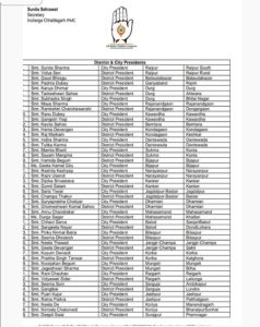 कोरबा/वन्दे छत्तीसगढ़.इन – अखिल भारतीय महिला कांग्रेस के द्वारा जिला अध्यक्षों और शहर अध्यक्षों के नाम घोषित किए गए हैं। सचिव और छत्तीसगढ़ प्रभारी सुनीता शेहरावत के द्वारा जारी की गई सूची के अनुसार कोरबा जिले में श्रीमती कुसुम द्विवेदी को शहर अध्यक्ष और श्रीमती प्रभा सिंह तंवर को महिला कांग्रेस जिला अध्यक्ष नियुक्त किया गया है। प्रभा तंवर वर्तमान में कटघोरा विधानसभा क्षेत्र अंतर्गत ग्राम रलिया से जनपद सदस्य हैं और पूर्व ब्लॉक अध्यक्ष महिला कांग्रेस कटघोरा की जिम्मेदारी निभा चुकी हैं। कुसुम द्विवेदी वरिष्ठ कांग्रेसी नेत्री हैं। इनके अलावा अन्य जिलों में भी नियुक्तियां की गई हैं।